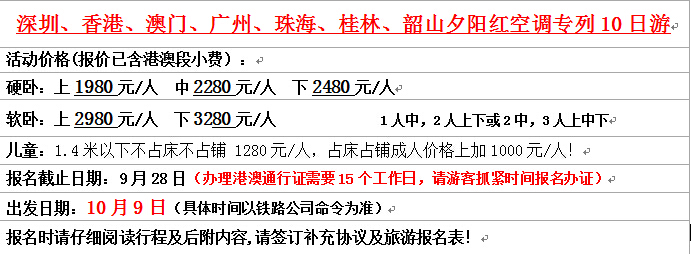深圳、香港、澳門、廣州、珠海、桂林、韶山夕陽紅空調(diào)專列10日游